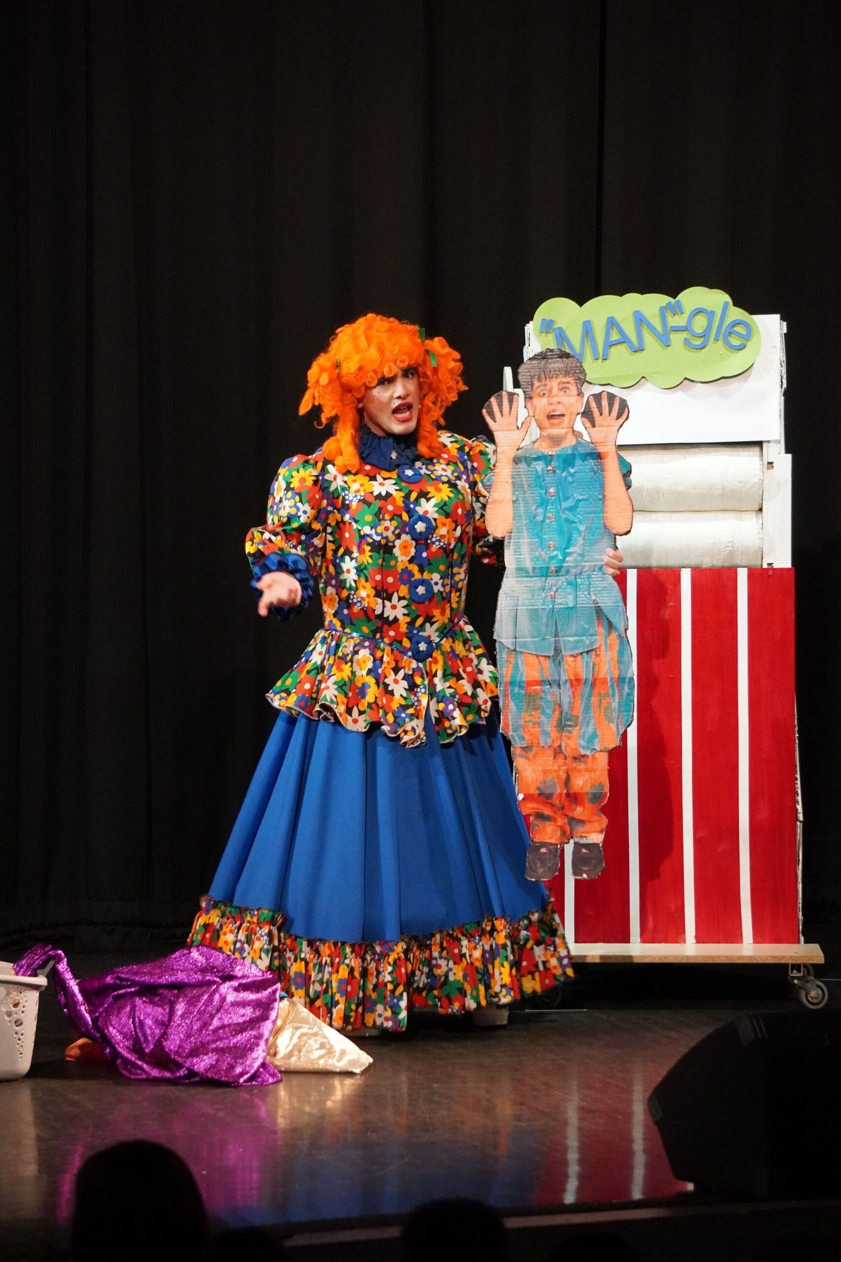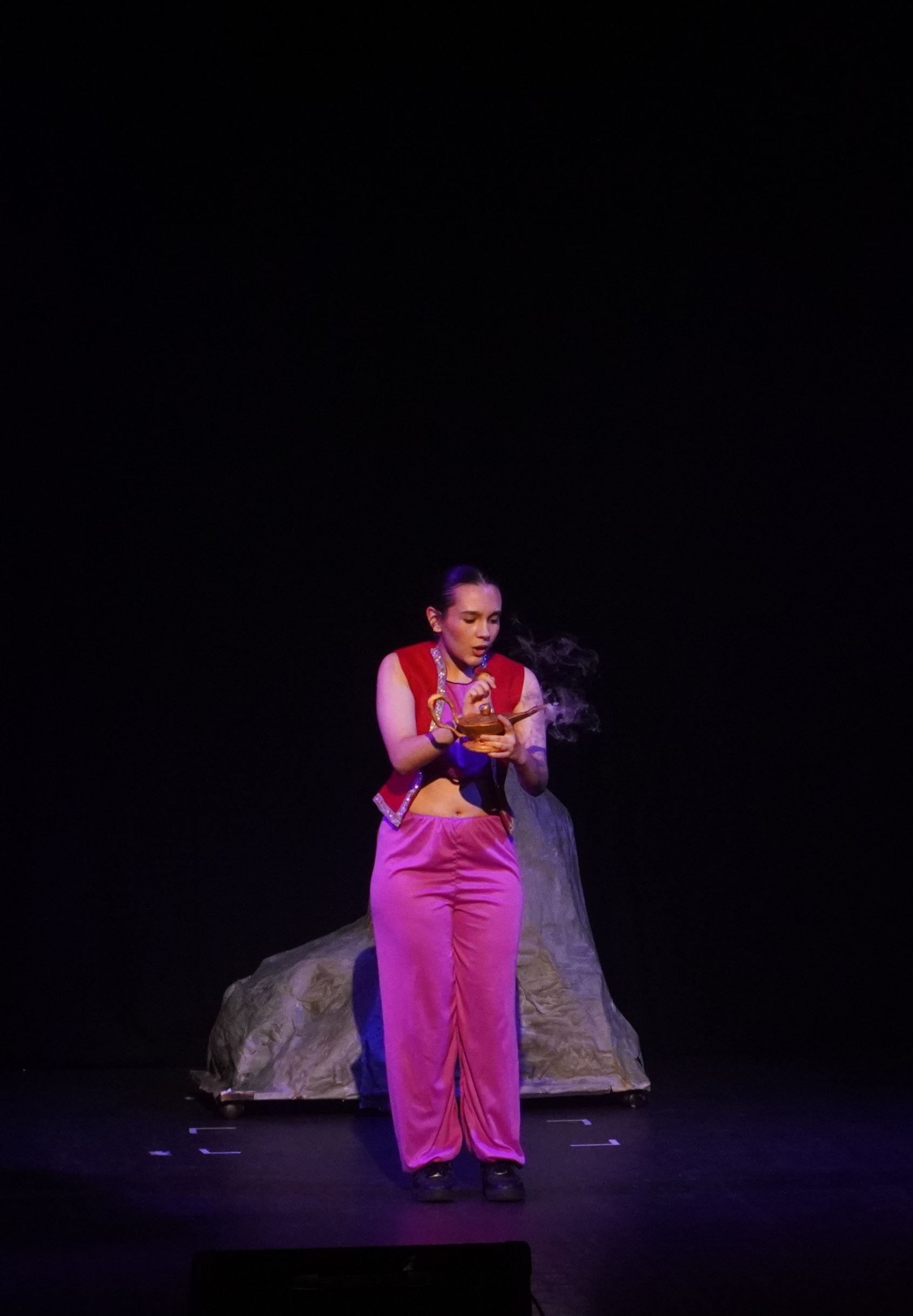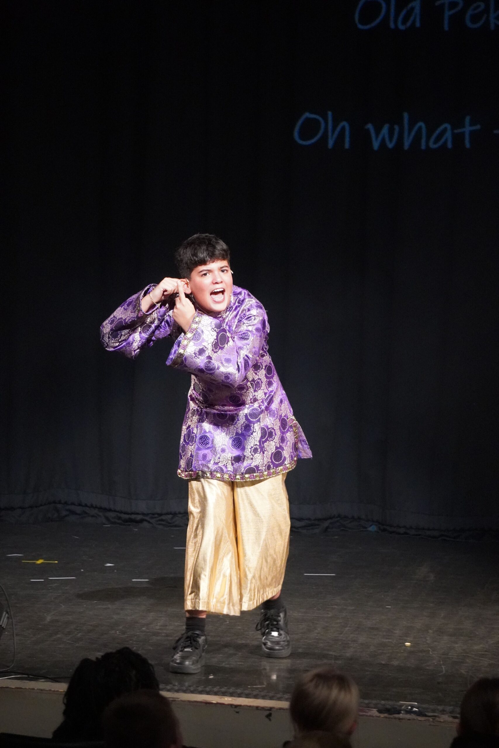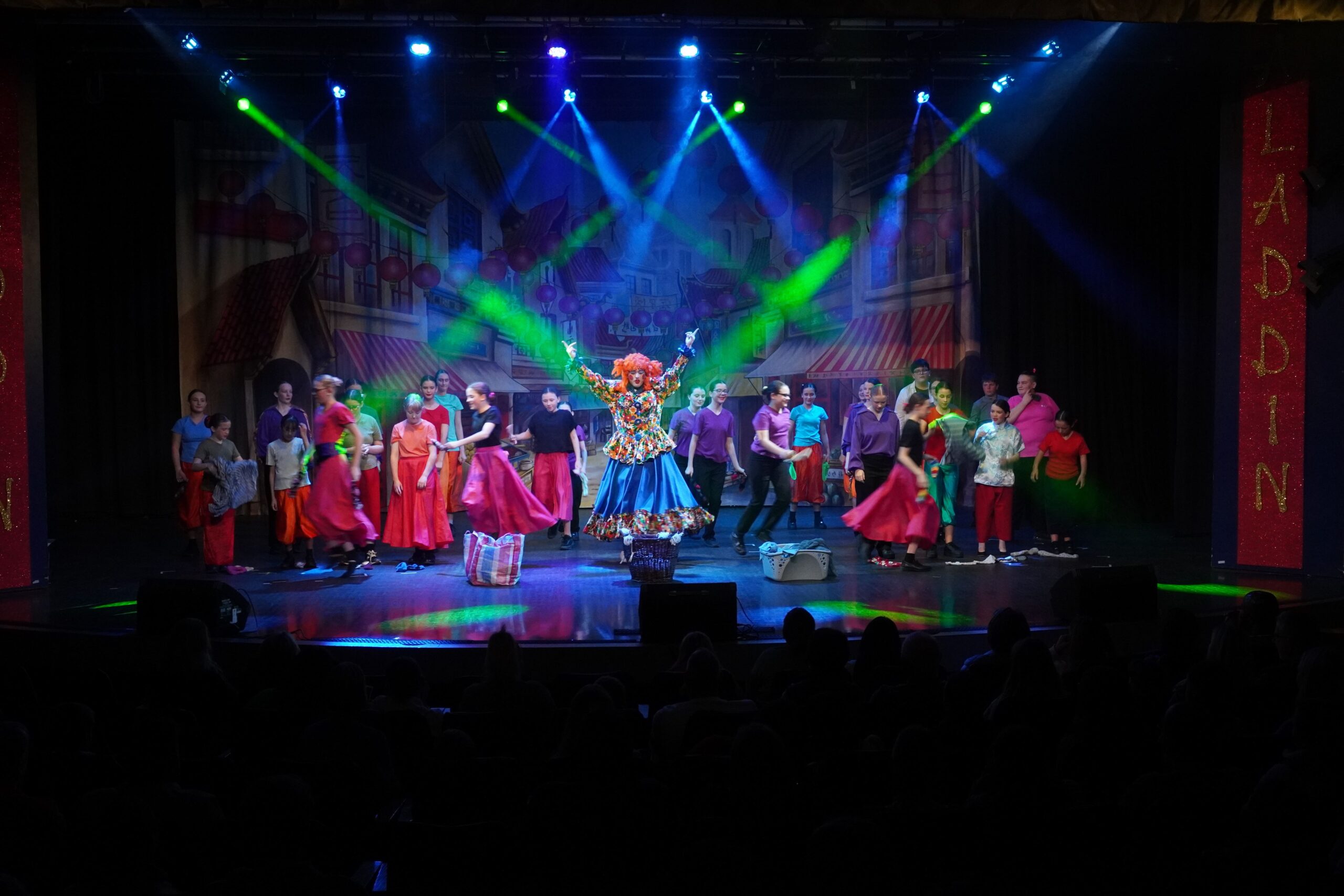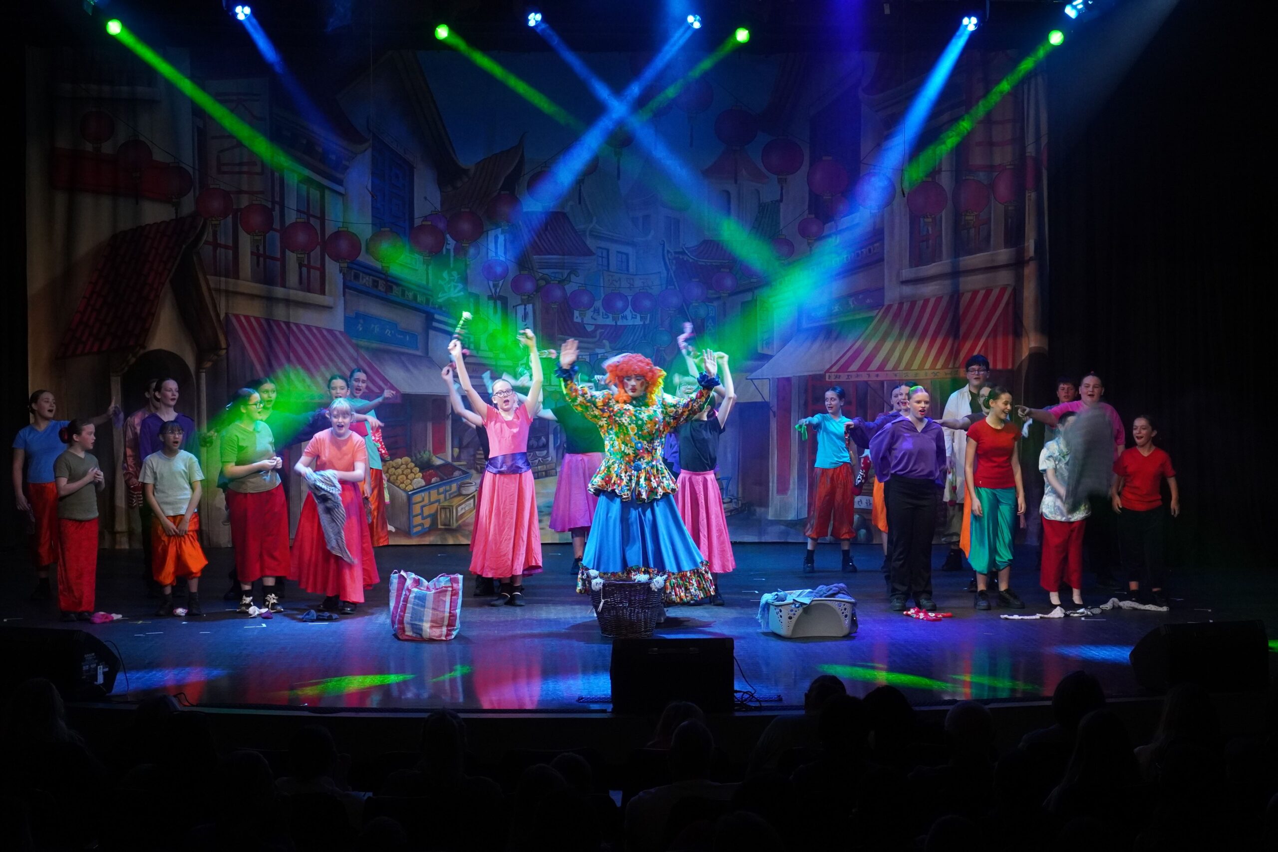Our show was a pantomime so there were songs, dances, jokes and interactive moments to get the crowd engaged. My favourite part was the washing scene; in it, Wishee crawled into a giant fake washing machine and Widow Twankey turned it on, then there was a comical scene where Wishee spun around in the washing machine and used props like a rubber duck to make the crowd laugh. My favourite part to act in was the end scene because I was a dancer and at the end I had to do three fun dances.
