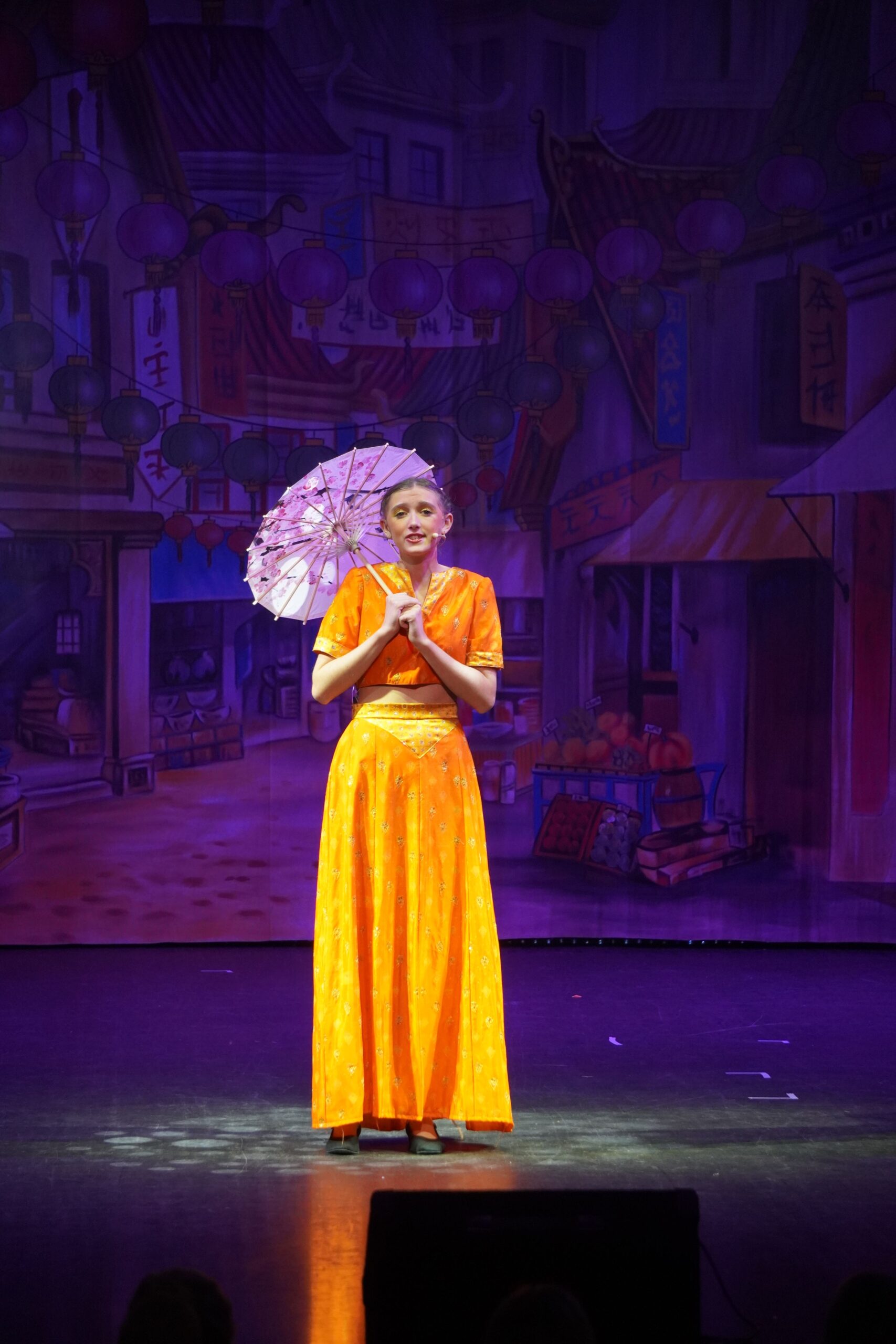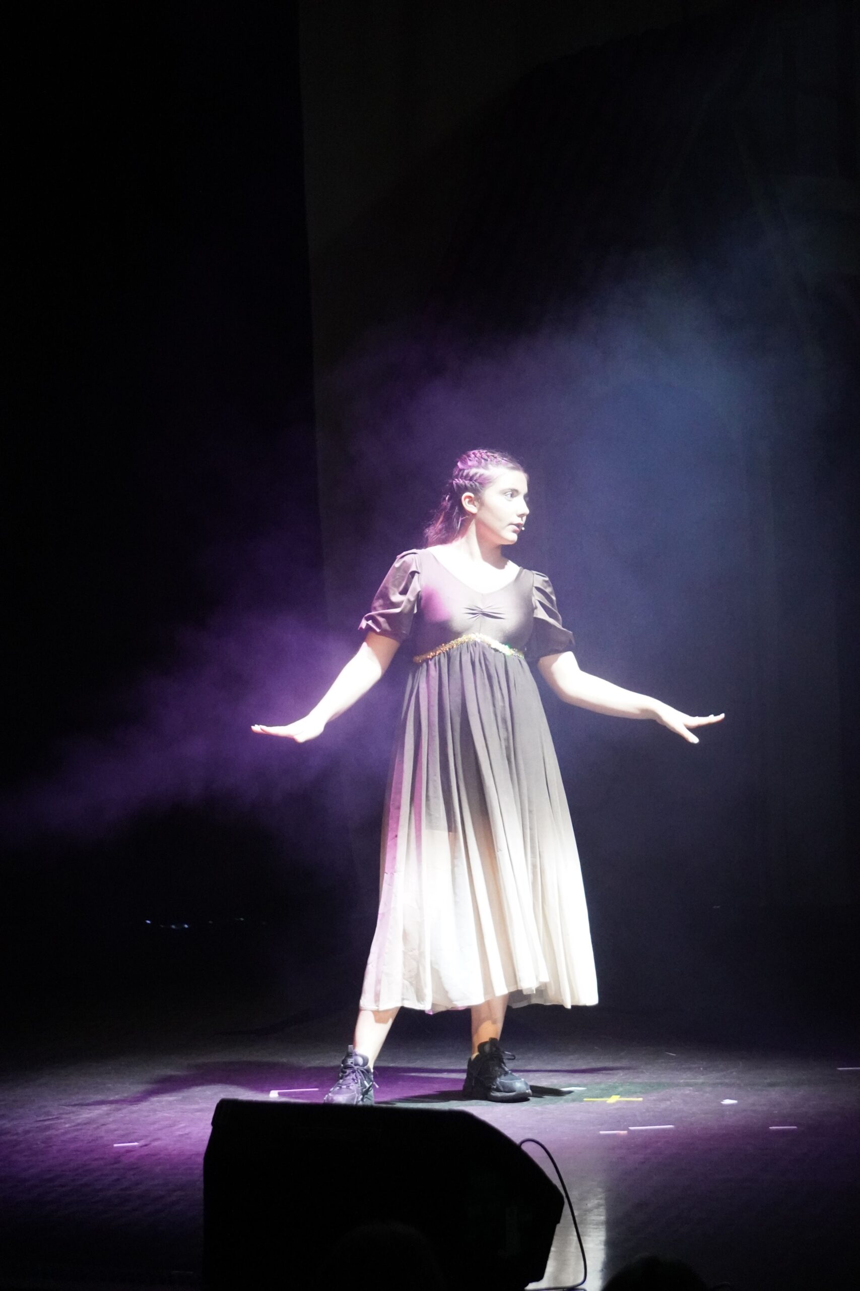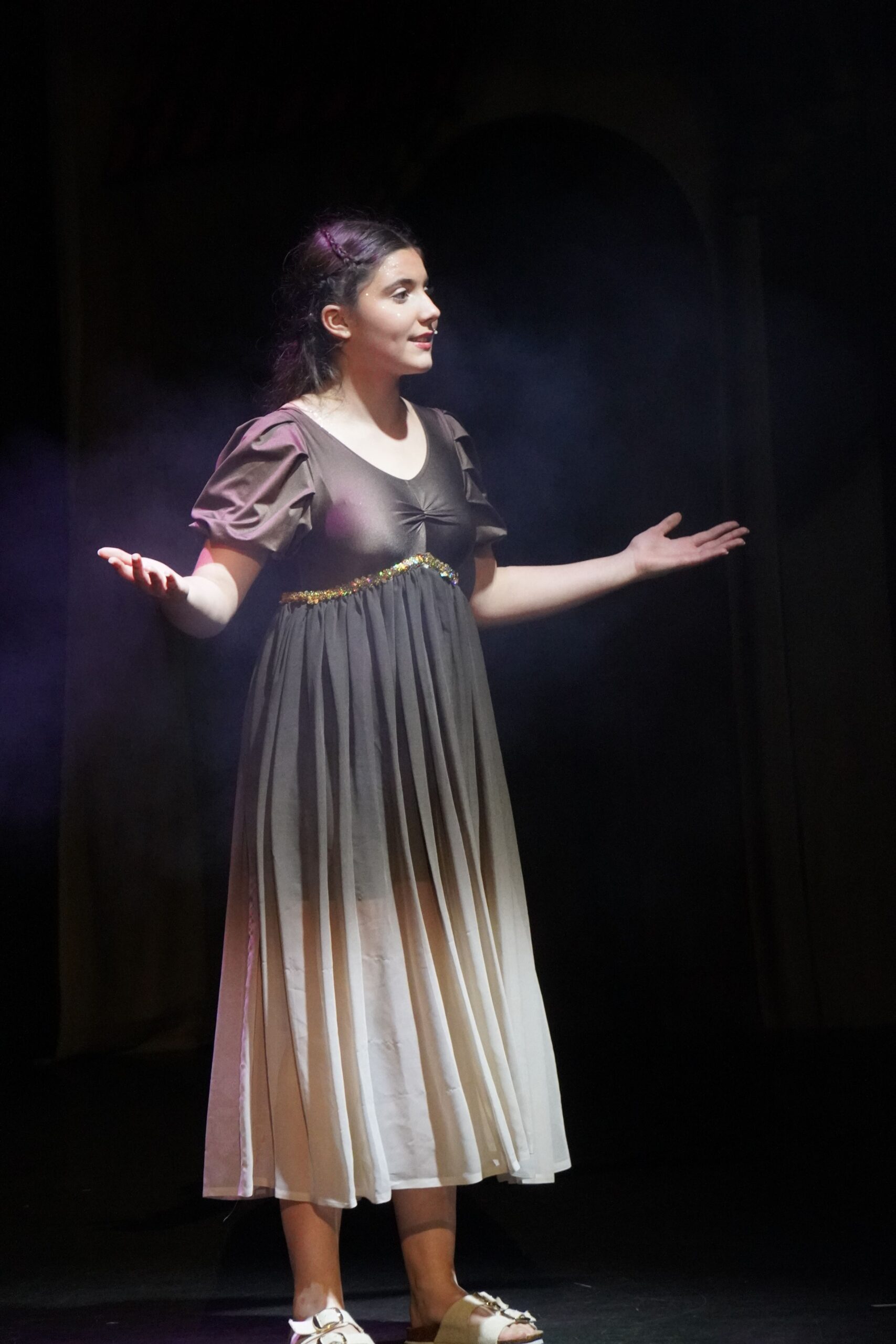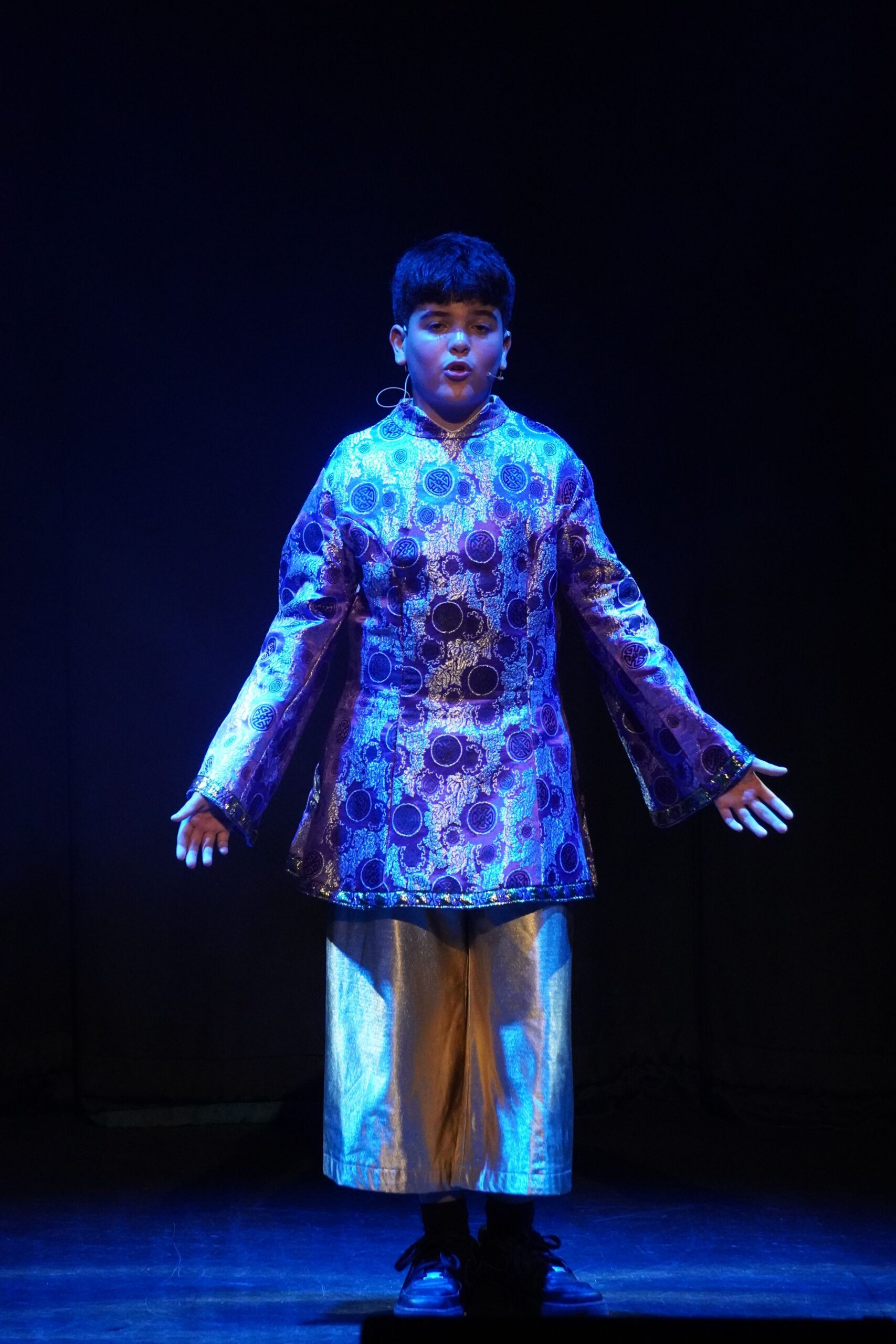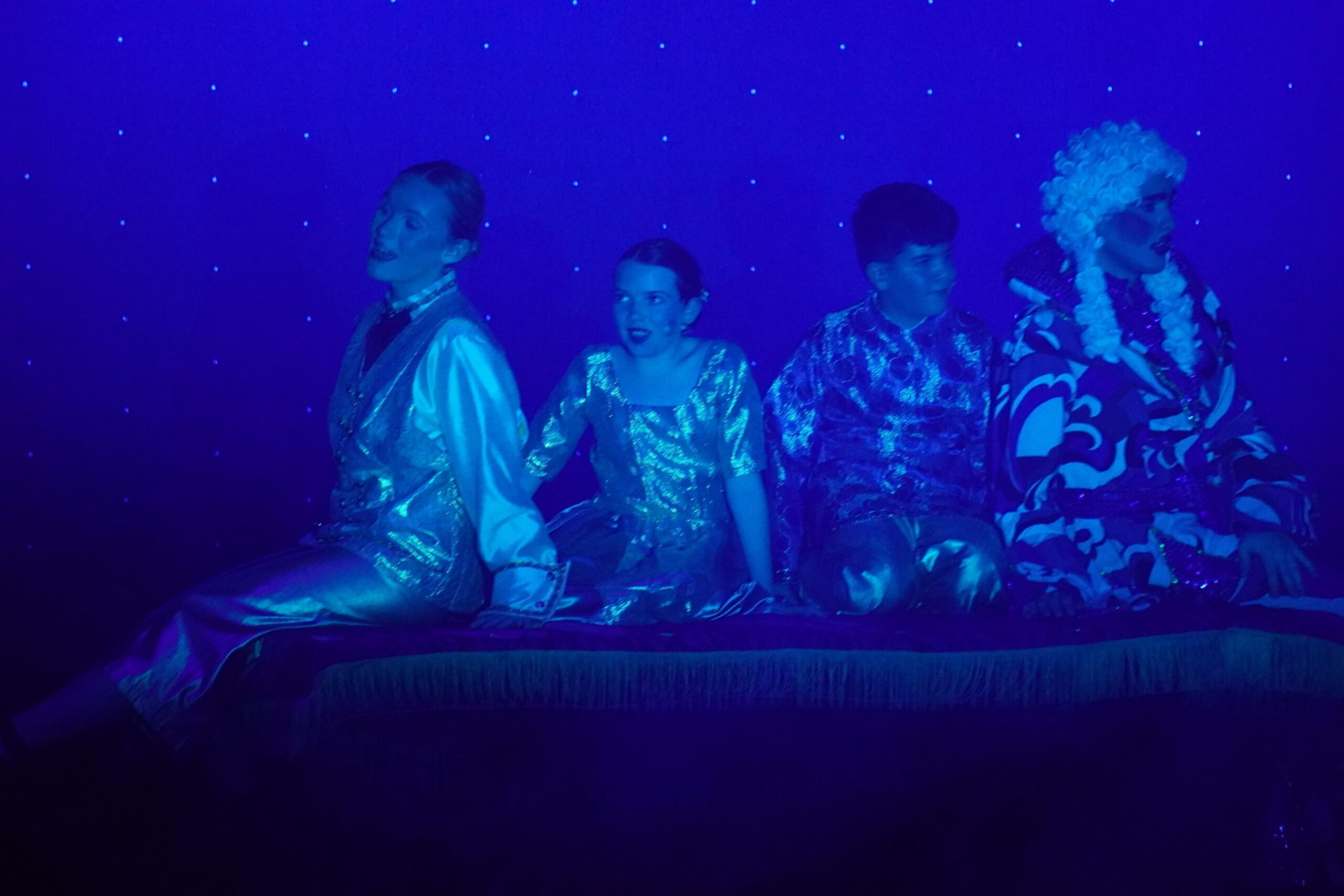 Our show was a pantomime so there were songs, dances, jokes and interactive moments to get the crowd engaged. My favourite part was the washing scene; in it, Wishee crawled into a giant fake washing machine and Widow Twankey turned it on, then there was a comical scene where Wishee spun around in the washing machine and used props like a rubber duck to make the crowd laugh. My favourite part to act in was the end scene because I was a dancer and at the end I had to do three fun dances.